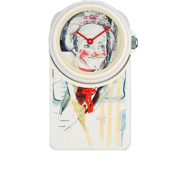 Original Rolf Knie Uhren – Schweizer präzisions Quartzwerk- bedrucktes Zifferblatt- rote Stabzeiger- weisses Duroplast Kunststoff-Gehäuse drehbar (Vakuum)- Gehäuse mit bedrucktem Selbsbildnis von Rolf Knie vom 3.2.1987- Mineralglas (flach)- Krone Metall (geschützt)- Klipmechanismus Limitierte spezial Edition Nur solange Vorrat! wassergeschützt(nicht zum Schwimmen geeignet)27 x 50mm,2 Jahre GarantiePreis inkl. original Box, Produkteinfo, Halterung zur Arretierung Entdecke die hochwertige Qualität dieser parktischen Uhr mit Klipp-Mechanismus! Rolf Knie Uhren mit Garantie vom Schweizer Uhrmacher Ungetragene Le Clip Uhr aus den 90er Jahren. Die Uhr kann gerne vor einer Kaufentscheidung besichtigt, und auch vor Ort in Basel abgeholt werden. Portofreie Lieferung. Der Künstler Rolf Knie Er ist der Sohn der mehrfachen Schweizer Meisterin im Tennis und im Eispaarlaufen Pierrette Dubois sowie Fredy Knie senior und Bruder von Fredy Knie junior, dem artistischen Leiter des Zircus Knie und Cousin von Franco Knie, technischer Direktor des Circus Knie in Rapperswil. Rolf Knie war bis in die Neunzigerjahre vor allem Clowndarsteller und Schauspieler, betätigte sich später als Kunstmaler und Bildhauer. Seine häufigsten Motive sind Szenen aus dem Zirkus. (Quelle Wikipedia)Wir hatten das vergnügen Rolf Knie und seine Partnerin Anabela 1991 kurz kennen zu lernen. Seine Werke wiederspiegeln sein Savoir-Vivre, seine ihm eigene Lebensphilosophie und selbst in den “düsteren Werken” eine positiv motivierende Ausstrahlung. Rolf Knie lebt in St. Gallenkappel und auf Mallorca ⬈ www.rolfknie.ch – Weitere Produkte von ⬈ Rolf Knie ⬈ Le Clip im Blog rund um die Uhr