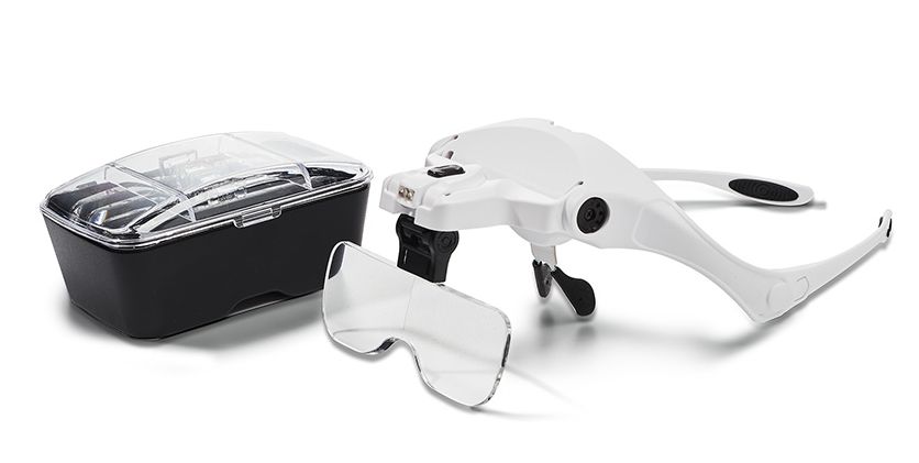 Praktische Brillenlupe mit 5 Aufsätzen für Vergrößerungen 1x – 1,5x – 2x – 2,5x und 3,5x. Mit LED-Beleuchtung, Nasenflügel, Lieferung inkl. Batterien.