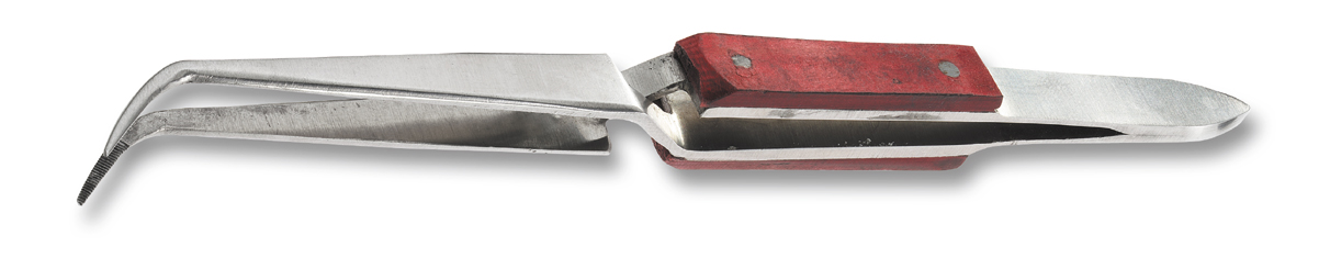 Polierter Stahl. Abgewinkelte Spitzen mit Längs-Hieb. Die Schenkel haben Fiberschalen als Handschutz, selbstspannend.
