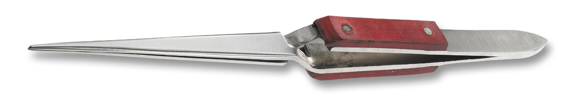 Polierter Stahl. Gerade Spitzen mit Längs-Hieb. Die Schenkel haben Fiberschalen als Handschutz, selbstspannend.