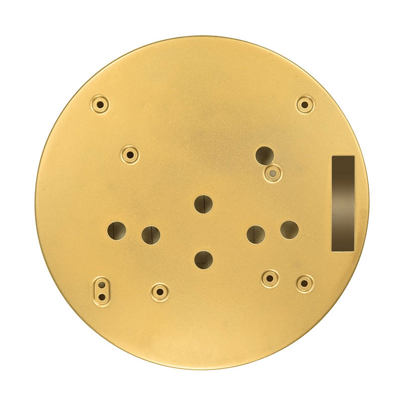 <br /><br />Goldfarben lackiertes Stahlblech mit umgebördeltem Rand. Mit Aufzugs- und Pfeilerlochungen für HERMLE-Uhrwerke.