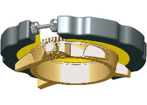 Ergonomischer Griff aus anodisiertem Aluminium mit Schraube zu Regulierung des Anschlags unbd Verhinderung, das die Lünette zerdrückt wird. Ring aus synthetischem Material zur Abhebung aller Arten von drehenden Lünetten ohne diese zu verkratzen.