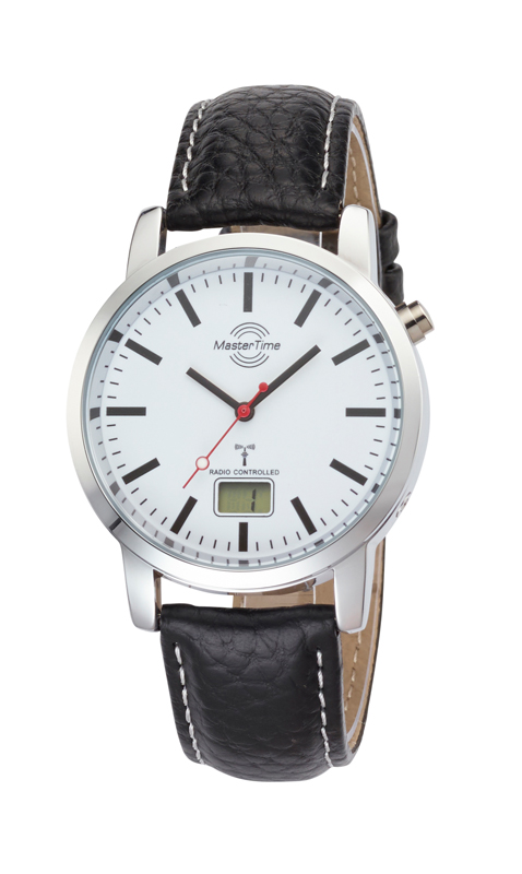 Master Time Funk Basic Herrenuhr in zeitlosem Bahnhofsuhren-Design mit digitaler Datumsanzeige. Dank Funkantrieb zeigt diese Herrenuhr mit Lederarmband stets die exakte Uhrzeit.