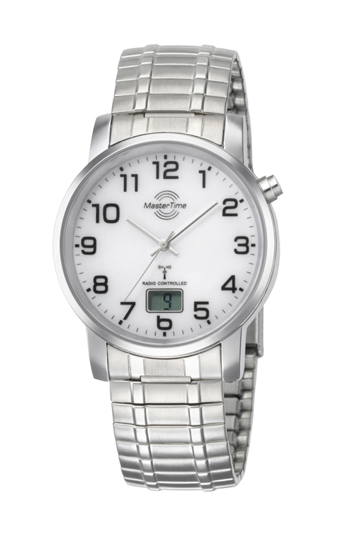 MasterTime Herren-Funkuhr Basic, silber/ weiß – mit Zugband – MTGA-10306-12M
