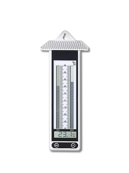 Eignet sich auch gut für draußen, da spritzwassergeschützt. Thermometer mit Minimum- und Maximum-Anzeige, Maße 224 x 90mm. Inkl. Batterie.