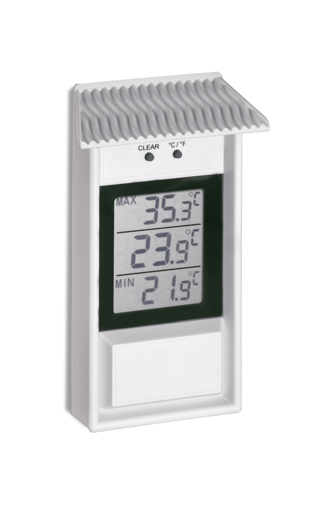 Eignet sich auch gut für draußen, da spritzwassergeschützt. Thermometer mit Minimum- und Maximum-Anzeige, Maße 132 x 80mm. Inkl. Batterie.
