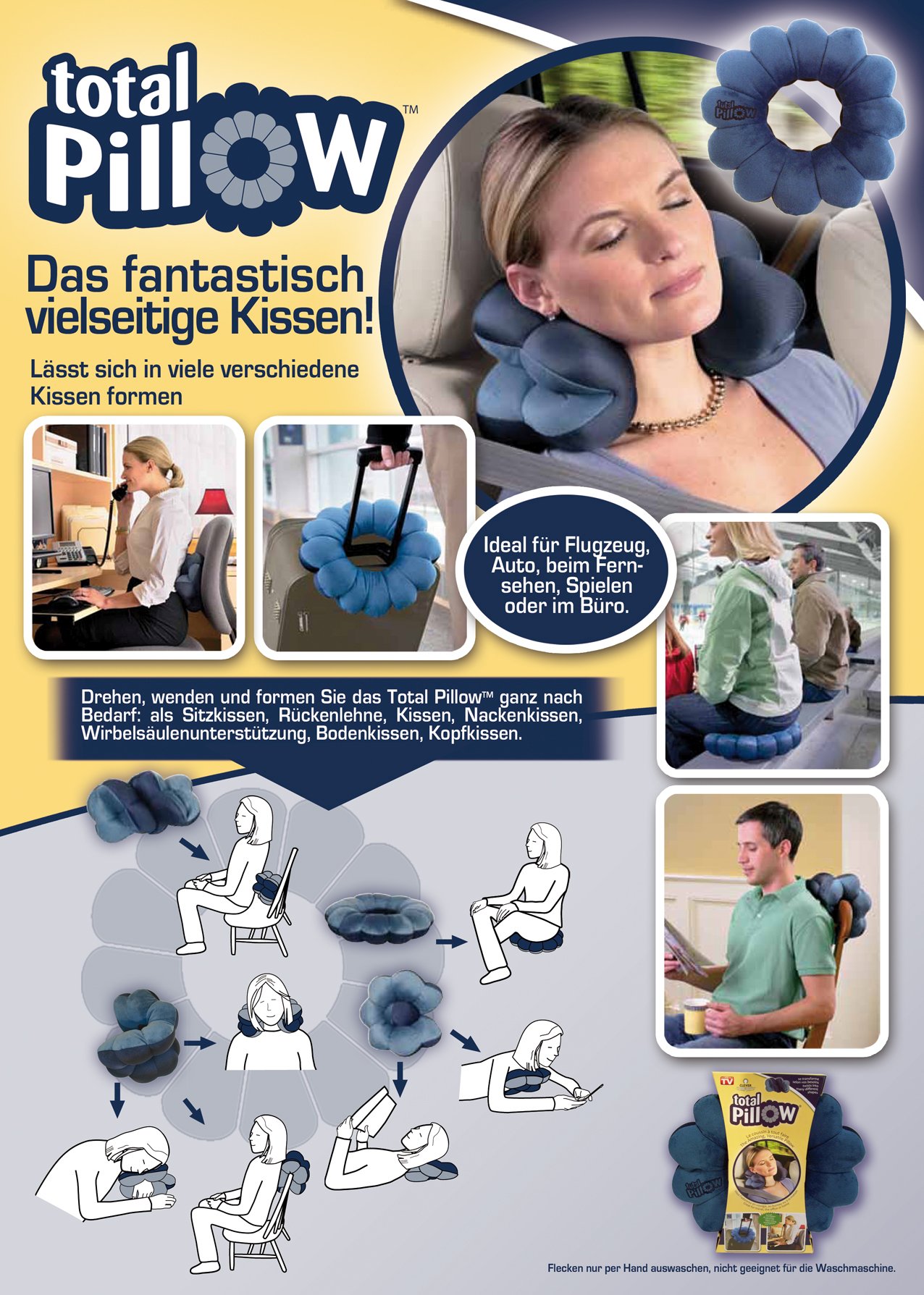 <br /><br />Das Mehrzweck-Kissen Total Pillow lässt sich in viele verschiedene Kissen formen. Drehen, wenden und formen Sie das Total Pillow ganz nach Ihrem Bedarf: