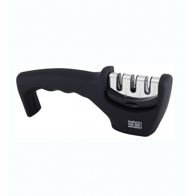 Genial einfach, genial günstig: Taylor's Eye für das Schärfen und Abziehen von Stahl- und Keramikmessern. 3-stufig. Stumpfe Klingen 3–4 mal durch Tungsten-Carbide-Schärfer ziehen, dann erfolgt der Feinabzug mit den feinen Keramikstäben durch 2–3-maliges Durchziehen der Klinge. Für besonders feinen Abzug können Klingen direkt mit den Diamantstäben geschliffen werden. Rutschhemmendes Gummimaterial für sicheres Arbeiten am Tisch. Maße: 20 cm.