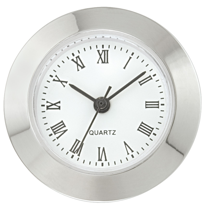 Mini-Einsteckwerk Import Trommel Ø 24mm, Lünette Ø 25,2mm verchromt, Zifferblatt weiß-antik, römische Zahlen
