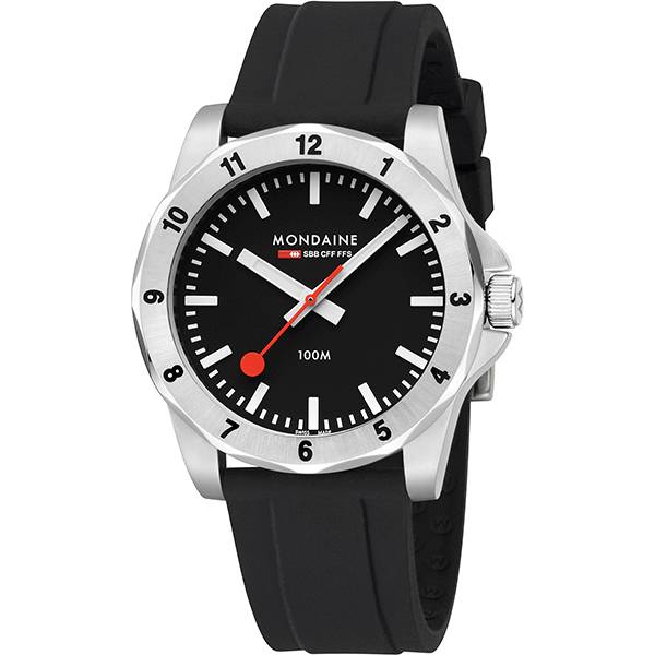 MONDAINE Official Swiss Railways Numeri Sport – Schweizer Quartzwerk (Caliber Ronda 713)- schwarzes Zifferblatt- weiss aufgedruckter Index Minutierie- weisse Minuten- Stundenzeiger (Superluminova)- original roter Schweizer Kellen-Sekundenzeiger (ausgewuchtet)- mattes Edelstahl Gehäuse- mit 12 gravierten Zahlen auf Stahllunette- kratzfestes Saphirglas (flach)- verschraubter Edelstahlboden- weiches Silikonarmband (schwarz) – Edelstahl DornschliesseDas neu entwickelte Edelstahlgehäuse ist gegenüber der bekannten, klassischen Form massiver und robuster und verleiht der Uhr einen sportliches Look.10 ATM nach DIN wasserdicht(zum Schwimmen geeignet)Ø: 42 mm, h: 10.8 mm, ca. 90g2 Jahre GarantiePreis inkl. original Box und Gebrauchsansweisung Original Uhren vom Schweizer Uhrmacher Zeitloses Schweizer Design mit dem gewissen Etwas. Natürlich trägt auch diese Linie das international renommierte Prädikat «Swiss Made». Neue Mondaine Uhr MSN.42120.RB mit Garantie des Herstellers. Auch diese Uhr kann gerne vor einer Kaufentscheidung besichtigt, und auch vor Ort in Basel abgeholt werden. Portofreie Lieferung. ⌚ OFFIZIELLE VERTRETUNG Wir verkaufen seit über 50 Jahren Uhren und sind ein zertifizierter Trusted Shop Entdecken Sie immer die aktuellste Auswahl an MONDAINE Uhren für Damen und Herren in unserem Fachgeschäft im Zentrum von Basel. Wir sind seit über 25 Jahren autorisierter Partner und führen fast alle erhältlichen Modelle an Lager. Bei UHREN-SHOP.ch finden auch noch weitere Bahnhofsuhren. Einfach auf das Logo klicken »