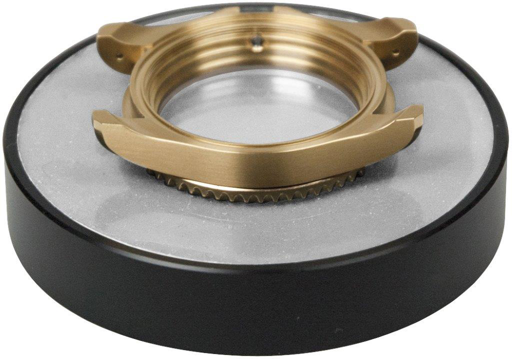 <br />Mit Kunststoffring eingefasst. Eine Seite für flache, eine Seite für gewölbte Uhrgläser.