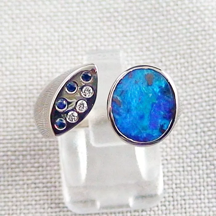 Opalring mit 3,34 ct Blauen Boulder Opal, Saphire & Diamanten 18k Weißgold