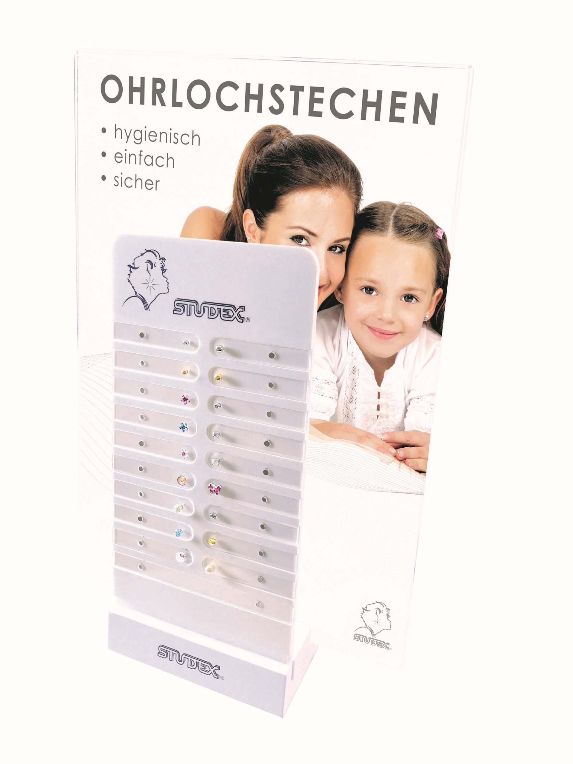<br /><br />Studex System 75 Display "Peggy" mit 18 Ohrsteckern (Bestseller) auf herausnehmbaren transparenten Kunststoffträgern, A4-Display, Spiegel und Bodenplatte.