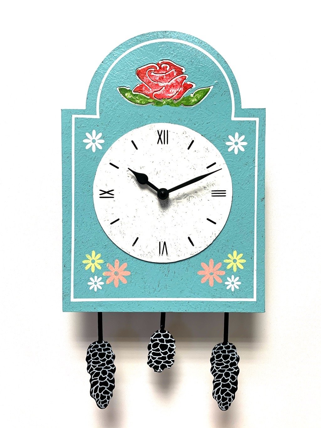 <br /><br />• Wanduhr aus Metall, handbemalt, ausgestattet mit einem hochwertigen, geräuschlosen UTS Quarzuhrwerk mit Pendelfunktion, made in Germany.