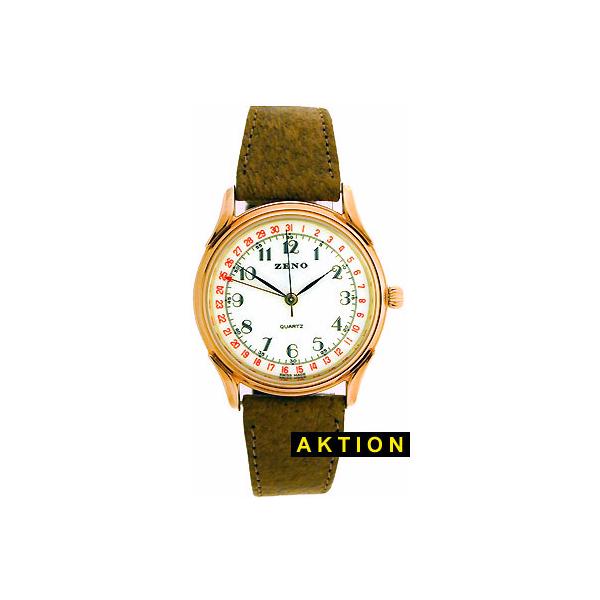 Uhr mit Zeigerdatum Schweizer präzisions Quartzwerk, weisses Zifferblatt mit ArtDeco-Zahlen, aufgedruckte Minuterie, analoge Datumsanzeige (Zeiger und Zahlen rot), feine Stabzeiger (schwarz), Zentral-Sekunde (ausgewuchtet)Poliertes Metallgehäuse (vergoldet), ArtDeco Bandansätze, Edelstahlboden (Pressitz), Zwiebelkrone (vergoldet), gehärtetes Mineralglas (flach), mattes Wildlederband (abgesteppt) mit Dornschliesse (vergoldet). Echtleder: Die für Leder charakteristische Beschaffenheit der Oberfläche macht jede Uhr zu etwas ganz Besonderem. Leichte Farbabweichungen zum Bild sind daher nicht auszuschliessen. nicht wassergeschützt!Ø: 31 mm, h: 6.5 mm,2 Jahre GarantiePreis inkl. original Uhrenetuie Original Uhr NOS aus den 80er Jahren = New Old Stock (Neuwertige Lageruhren) – Nur solange Vorrat! Diese Uhren wurde in unserem Atelier fachgerecht gelagert. Kleine Kratzspuren sind nicht ganz auszuschliessen Pflegetipps Bleibt die Uhr stehen, sollte sie sofort zum Fachgeschäft gebracht werden, damit sie kontrolliert und eine evtl. leere Batterie weder in der Uhr noch in der Umwelt Schaden anrichtet (Auslaufgefahr). Der Batteriewechsel sollte regelmässig im Abstand von 1 ½ bis 3 Jahren im Fachgeschäft durchgeführt werden. Gegebenenfalls wird auch der Stromverbrauch und der Zustand der Dichtungen überprüft. Das Lederband Ihrer Uhr ist ein Verschleissteil. Naturprodukte nützen sich durch Feuchtigkeit, Schweiss, Chemikalien und Abrieb ab. Lederbänder sollten deshalb (wie auch aus hygienischen Gründen) je nach Tragegewohnheit alle 6-12 Monate erneuert werden. Beim Wechsel werden auch die Haltestifte (Federstege) überprüft und allenfalls ausgetauscht. Pigatt Uhren aus Basel ZENO-WATCH BASEL ist eine traditionsreiche, Familiengeführte Uhrenfabrikation, die 1868 von Jules Godat gegründet und seit 1922 unter dem Markennamen Zeno Uhren produziert. Anfangs auf die Produktion von Eisenbahner Taschenuhren spezialisiert, fertigte man schon in den 1930er Jahren Armbanduhren für Piloten. In den 60er Jahren konstruierte Zeno die unter Vakuum abgedichteten Compressor Uhren und erweiterte die Fliegeruhren Kollektion, für die ZENO-WATCH BASEL auch heute noch bekannt ist. Die Kollektion bietet aber auch noch diverse andere Zeitmessinstrumente wie die Airplane oder Army Diver Taucheruhren, die Bauhaus Design Uhren, die Gentlemen oder die zeitlos schönen Magellano Uhren… Im Inneren der Uhren findet man jegliche Arten von Schweizer Uhrwerken: Mechanische mit automatischem Aufzug (Automatik) oder Batterie betriebene Quarzwerke. Viele mechanische Uhren sind mit einem Glasboden ausgestattet, damit man das Uhrwerk während seiner Arbeit betrachten kann. Zeno ist bekannt für ganz grosse Uhren bis 55mm fertigt aber Modelle in allen Grössen. Viele Versionen werden nur in kleinen Serien hergestellt und regelmässig Sondereditionen für Uhrensammler mit alten und seltenen Uhrwerken. Wir führen Uhren von Zeno-Watch Basel schon seit 50 Jahren und sind nach wie vor von der Qualität und dem guten Preis-Leistungsverhältnis überzeugt. Original New Old Stock Uhr AKTION: Original Schweizer New Old Stock Uhren von ZENO-WATCH BASEL. NOS = Neuwertige alte Lageruhren – Nur solange Vorrat! Diese Uhren wurden in unserem Atelier fachgerecht gelagert. Kleine Kratzspuren sind nicht ganz auszuschliessen. Ungetragene Armbanduhr mit Garantie vom Schweizer Uhrmacher. Die Uhr kann gerne vor einer Kaufentscheidung besichtigt, und auch vor Ort abgeholt werden. Portofreie Lieferung Wir sind offizielle Konzessionäre. Sie können alle Modelle auch telefonisch bestellen. Gerne machen wir Ihnen ein Angebot! ⌚ OFFIZIELLE MARKEN VERTRETUNG Wir verkaufen seit über 50 Jahren Uhren und sind ein zertifizierter Trusted Shop Als autorisierter Schweizer Fachhändler der Marke ZENO-WATCH BASEL profitieren Sie auch online von den entscheidenden Vorteilen hinsichtlich der Echtheit, den Garantieleistungen und des Nachverkaufsservice beim Online-Kauf. Wir führen in unserem Uhren Fachgeschäft in Basel noch viele weitere Schweizer Quartzuhren an Lager. Auch bei UHREN-SHOP.ch finden Sie noch mehr Zeno Armbanduhren. Einfach auf das Logo klicken »