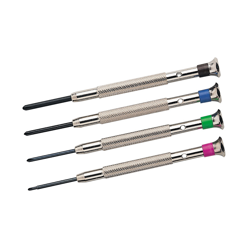 <br />Verschromter, farbkodierter Schaft mit kugelgelagertem Drehknopf, gehärtete Klingen. 4er-Satz mit 1,5/2/2,5/3 mm.