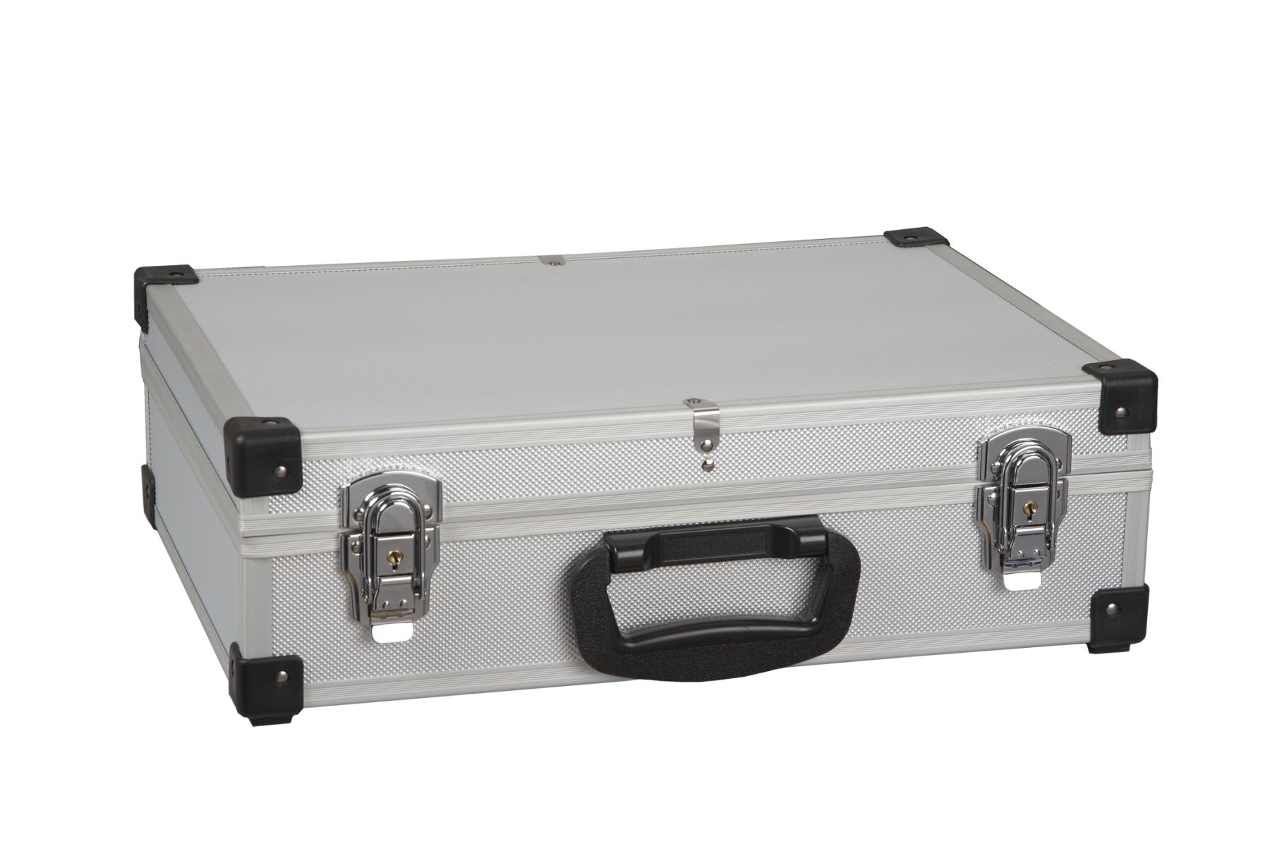 Robuster Rahmenkoffer aus festem Alu mit 6 variablen Facheinteilungen und herausnehmbaren Werkzeugeinlagen. Außenmaße: 430 x 315 x 140mm, Innenmaße: 410 x 280 x 120mm.