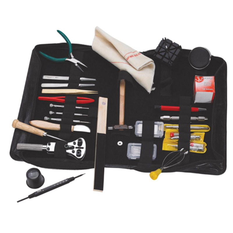 Professionelles Werkzeug-Set in Ledertasche mit allem, was ein Uhrmacher benötigt, u. a. Kornzangen, Gehäuseöffner Jaxa, Montagekissen, Lupe, Uhrmacherhammer, Zeigerabheber, Federstegsortiment, Schraubendreher, Poliermittel u.v.m.