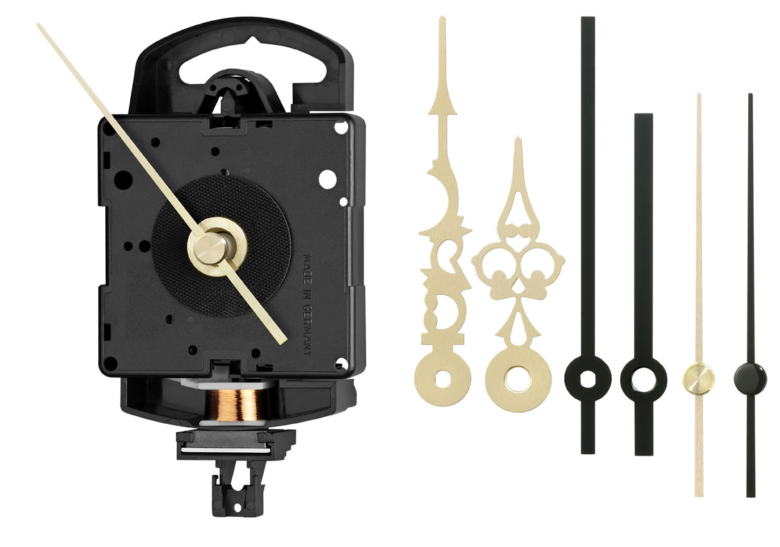 <br /><br />Mit 1 Paar Balken-Zeiger, schwarz, 80/55mm – 1 Paar Antik-Zeiger, Alu Gold, 75/50mm sowie je 1 Sekundenzeiger schwarz und Alu Gold (Je 60mm)