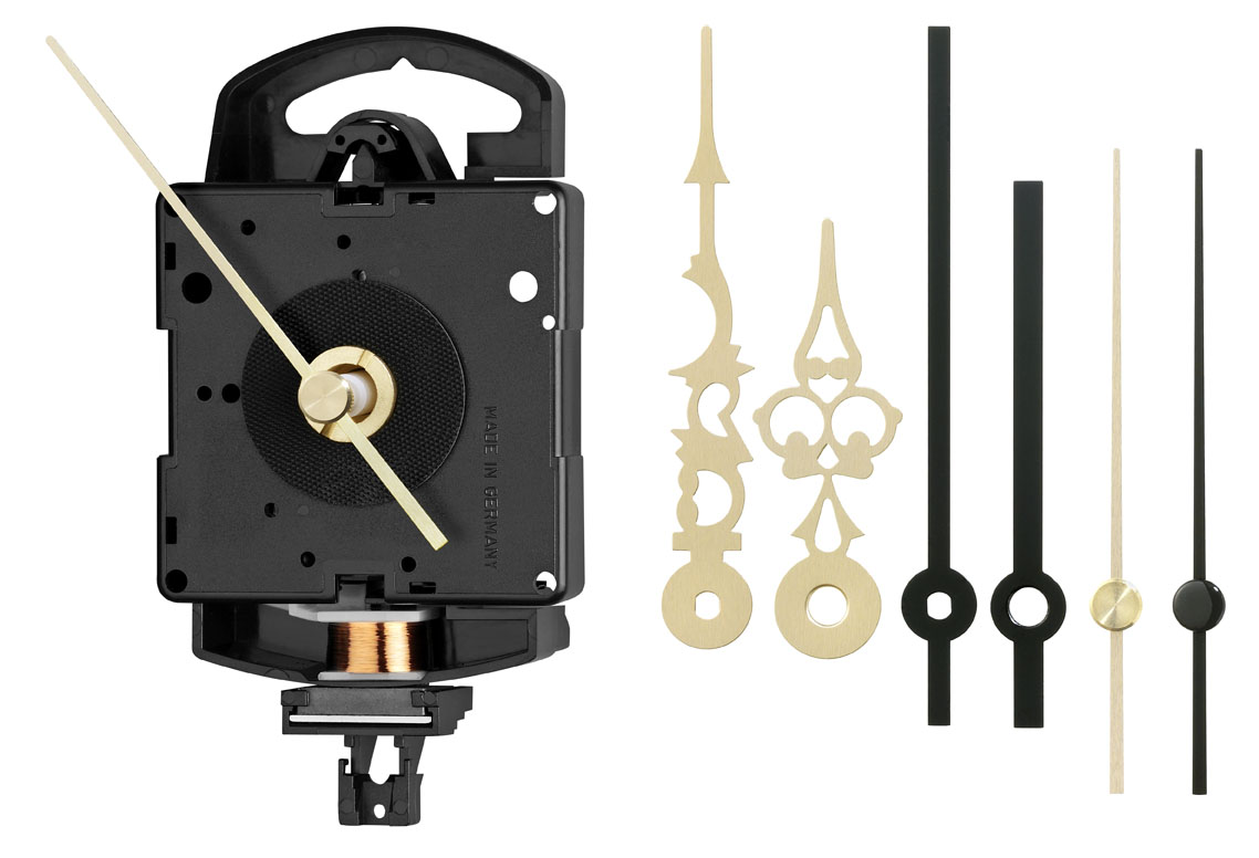 <br /><br />Mit 1 Paar Balken-Zeiger, schwarz, 80/55mm – 1 Paar Antik-Zeiger, Alu Gold, 75/50mm sowie je 1 Sekundenzeiger schwarz und Alu Gold.