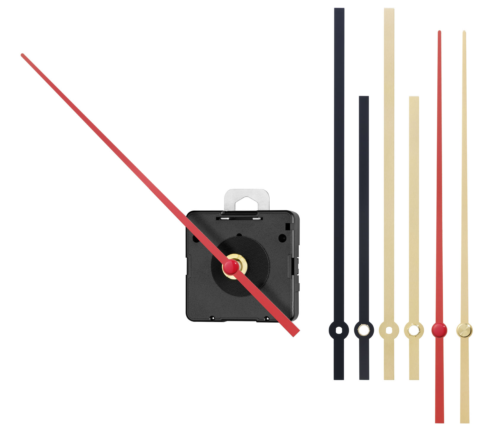 <br /><br />1 Paar Balken-Zeiger, schwarz, 161/117mm – 1 Paar Balken-Zeiger, Alu Gold, 161/ 117mm sowie je 1 Sekundenzeiger rot und Alu Gold (je 150mm)