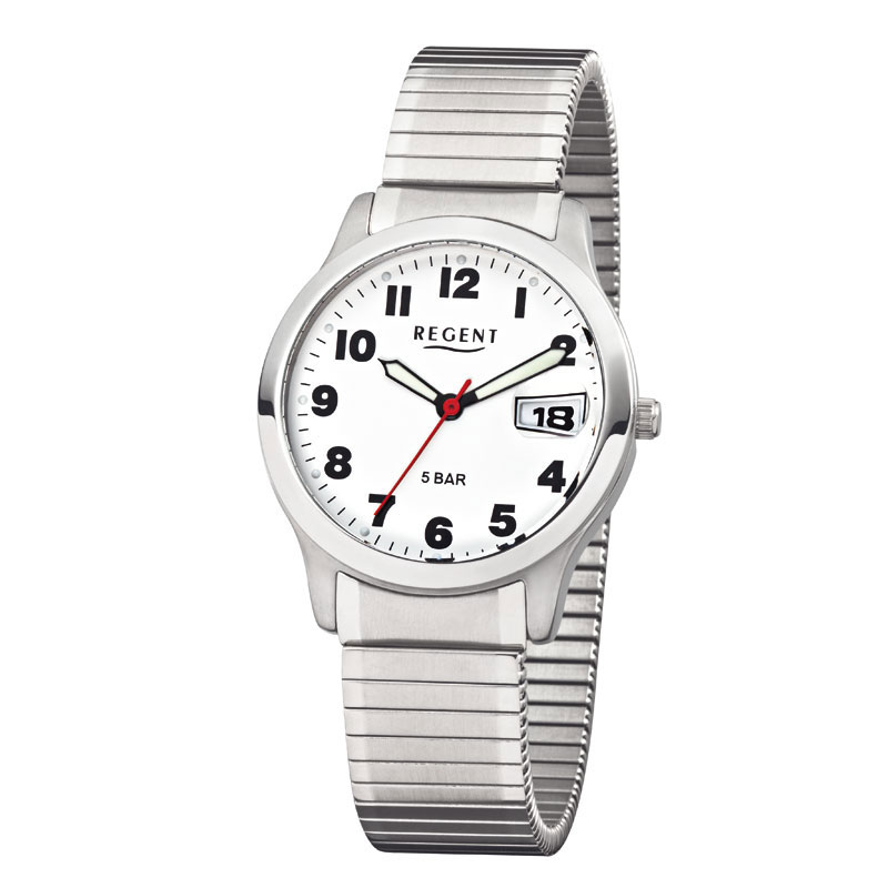 <br />Weißes Zifferblatt mit arabischen Ziffern, nachleuchtende Zeiger und Stundenpunkte,