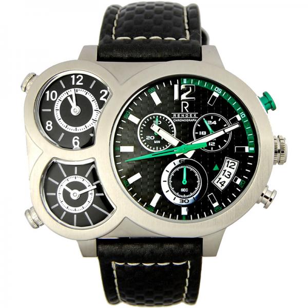 Extra grosser Chronograph – Präszisions Quartzwerk Chrono (Cal. Miyota OS20) – 3 Zeitzonen (3 Uhrwerke) – Stoppuhr (1/1-Sekunde bis 60 Minuten) – Zifferblatt schwarz mit Index und Leuchtzeigern – kleine Sekunde bei 6h – permanente 24-Std Anzeige bei 2h – Datumsanzeige (4h) mit Schnellkorrektur – Edelstahlgehäuse matt – gehärtetes Mineralglas (gewölbt) – Zylinderdrücker – Lederarmband mit grüner Ziernaht – Materialien erfahrungsgemäss antiallergisch 3 ATM wasserdicht (nach DIN) nicht zum Schwimmen geeignet kurzfristiger Wasserkontakt ist problemlos 50 x 40 x 10 mm, 2 Jahre Garantie Preis inkl. original Box, Gebrauchsanweisung mit Produkteinfos Rendex verwendet Schweizer Uhrenbatterien von RENATA Itingen BL. Rendex Uhren Echte Fashion-Highlights für mutige, modische Menschen mit exklusivem Geschmack. Alle Rendex Herren- und Damenuhren wurden nur in kleinen Stückzahlen produziert und zum Teil sind nur noch wenige erhältlich! Sie können alle Modelle auch telefonisch bestellen. Gerne machen wir Ihnen ein Angebot! Nur solange Vorrat! Von dieser Uhr wurden nur wenige produziert und es werden auch keine weiteren mehr hergestellt. Daher besser rasch entscheiden. ⌚ OFFIZIELLE VERTRETUNG Wir verkaufen seit über 50 Jahren Uhren und sind ein zertifizierter Trusted Shop Als autorisierter Schweizer Fachhändler der Marke RENDEX profitieren Sie auch online von den entscheidenden Vorteilen hinsichtlich der Echtheit, den Garantieleistungen und des Nachverkaufsservice beim Online-Kauf. Wir führen in unserem Uhren Fachgeschäft in Basel noch viele weitere Schweizer Sportuhren an Lager. Auch bei UHREN-SHOP.ch finden Sie noch mehr Rendex Uhren. Einfach auf das Logo klicken »