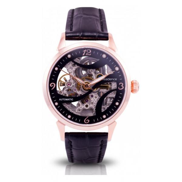 Traditionelle Uhrmacherkunst zu einem überzeugenden Preis – dafür steht die Uhrenmarke RESIDENCE. Ein PVD-beschichtetes Edelstahl-Gehäuse gehört ebenso zur hochwertigen Ausstattung der Damenuhr wie ein offenes, teilkoloriertes Zifferblatt, das Einblick in die präzise Feinmechanik des skeletieren Uhrwerks erlaubt mechanische Skelettuhren – Automatik Uhrwerk (selbstaufziehend) – freie Sicht auf das Uhrwerk – offenes Zifferblatt mit schwarzen Dekorstreifen   mit aufsetzten Zahlen und weissen Kristallen – vergoldete Leuchtzeiger – 17 Rubinlagersteine – Gangreserve ca. 36 Stunden – vergoldetes Edelstahl Gehäuse (poliert) – kratzfestes Saphirglas (flach) – griffige Zeigerstellkrone – Edelstahl Sichtglasboden – geprägtes Kalbslederband (schwarz) – Edelstahl-Dornschliesse – Materialien erfahrungsgemäss antiallergisch Echtleder: Die für Leder charakteristische Beschaffenheit der Oberfläche macht jede Uhr zu etwas ganz Besonderem. Leichte Farbabweichungen zum Bild sind daher nicht auszuschliessen. WR 5 ATM Wasser resistent zum Schwimmen ist die Uhr nicht geeignet! Kurzfristiger Wasserkontakt ist problemlos Ø: 35 mm; h: 11 mm, ca. 80g 2 Jahre Garantie Preis inkl. Geschenkbox Neue Skelett Armbanduhr mit Garantie des Herstellers. Auch diese mechanische Uhr kann gerne vor einer Kaufentscheidung besichtigt, und vor Ort in Basel abgeholt werden. Portofreie Lieferung in der Schweiz. ⚠️ ACHTUNG Wir führen diese Uhr nicht in unserem Fachgeschäft Au Bijou in Basel an Lager, bestellen diese aber auf Wunsch gerne zur Ansicht. ⌚ OFFIZIELLE MARKEN VERTRETUNG