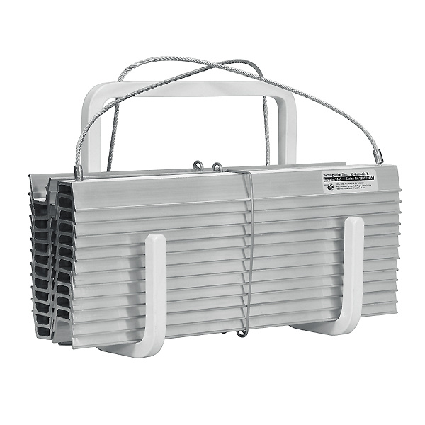 <br /><br />Zusammengelegt nach dem einzigartigen Sicherheits-Patentsystem, benötigt die Rettungsleiter nur minimalen Stauraum (Packmaße jeweils 33 x 20 x 10cm). Sie passt bequem in Reisekoffer, Schreibtisch oder Büroregal. Dabei ist sie wartungsfrei und aufgrund der verwendeten Materialien praktisch unbegrenzt haltbar.