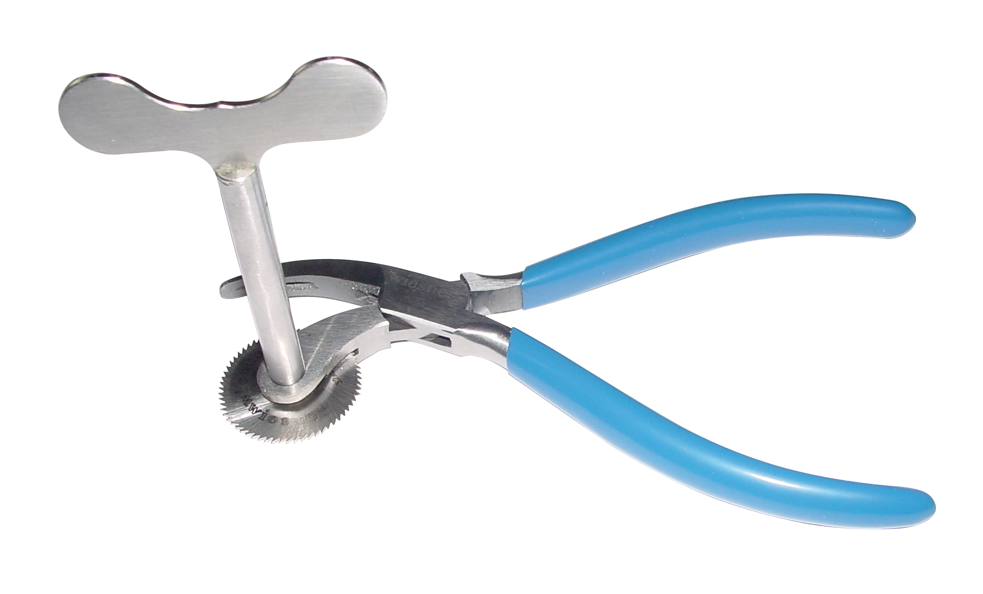 Zum Durchsägen von Ringschienen am Finger. Eine Zangenbacke schützt den Finger vor Verletzungen durch das Sägeblatt. Die große Flügelschraube mit hochlegiertem Schnellstahlsägeblatt und deren grobe