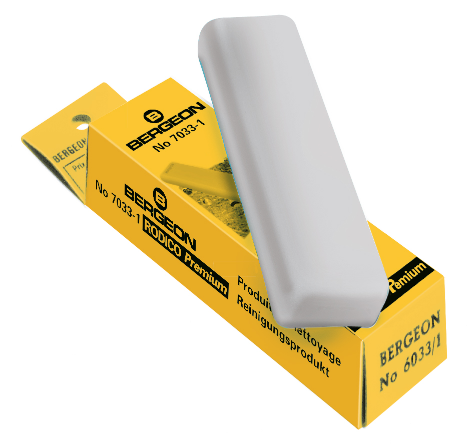 Zum Reinigen von Zapfen, Rädern usw., zum Entfernen von Fingerabdrücken auf Platinen, Zifferblättern, Zeigern usw. und zum Entfernen von überflüssigem Öl auf Steinen. Verbesserte Ausführung des seit Jahrzenhnten bekannten Rodico grün. Die neue graue Reinigungsmasse ist weicher als das bekannte grüne Produkt und ist aufnahmefähiger für Öle und Schmutzpartikel.