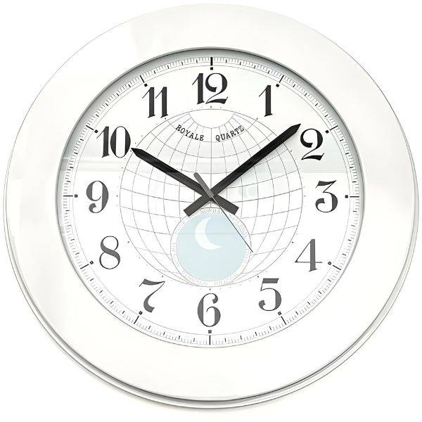 Grosse weisse Wanduhr – Präzisions Elektro-Quartzwerk (CE-zertifiert)- weisses Zifferblatt  aufgedruckte Erdkugel mit Mondphase auf hellblauem Kreis- schwarze Klassikzahlen und Mintuerie- schwarze Minuten- und Stundenzeiger- grauer Sekundenzeiger (ausgewuchtet- kolorietes Stahlgehäuse (weiss)- echtes Mineralglas (flach)Einfache Montage!Staubgeschützt Nur für den Innengebrauch!Ø: 55 cm, h: 5 cm, ca. 700g2 Jahre GarantiePreis inkl. Kartonbox, 1 Batterie (LR6/AA, 1.5V), VRG Original Uhren vom Schweizer Uhrmacher Die extra grosse Wanduhr kann gerne vor einer Kaufentscheidung besichtigt, und auch vor Ort in Basel abgeholt werden. Portofreier Versand! Weitere Infos über Büro Wanduhren » im Blog