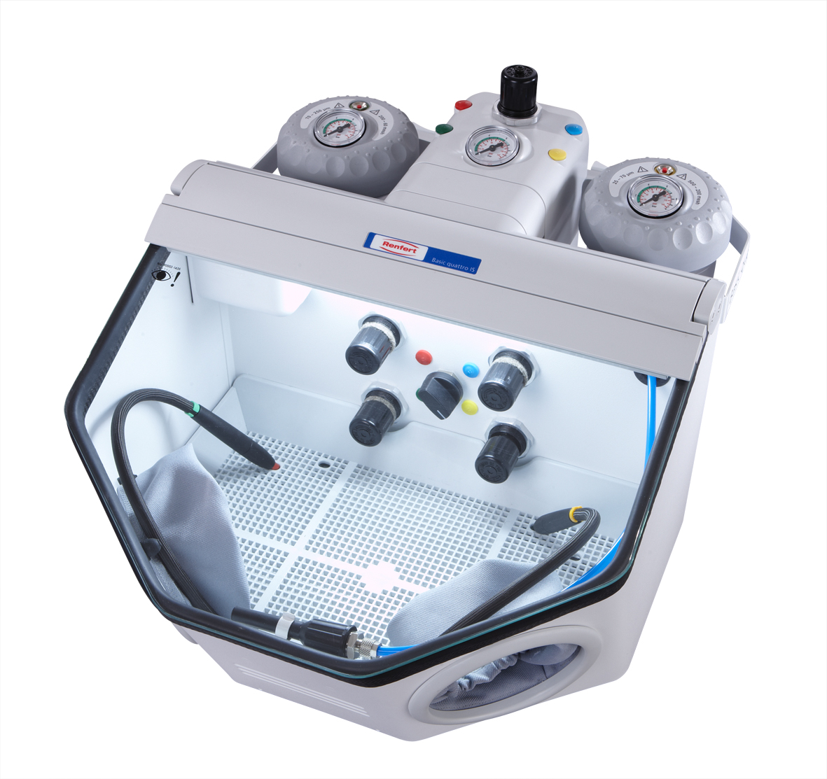 <br />Pulverbeschichtetes Metallgehäuse mit großer, aufklappbarer Sichtscheibe. LED-Leuchten 4800 Lux für optimale Ausleuchtung der Strahlkammer. Schlauchanschluss für Standard Schnellkupplung zum Anschluss des externen Kompressors mit Anschlussdruck 6 – 10 bar; Ansaugstutzen für externe Absaugung (Innen-Ø 35 mm, Außen-Ø 40 mm).