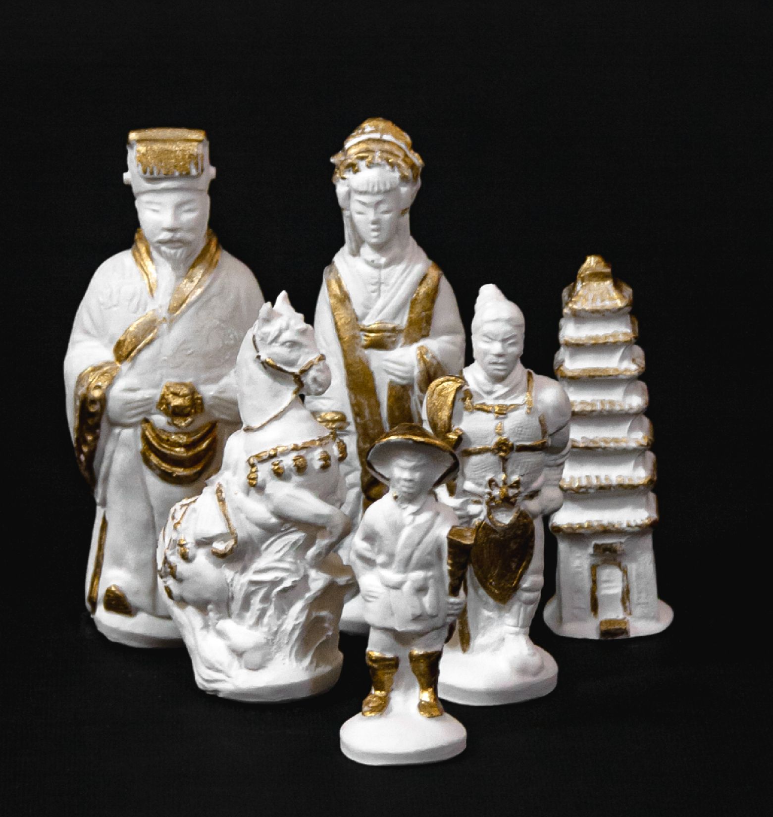 <br />1x König, 1x Königin, 1x Pferd, 1x Läufer, 1x Turm, 3x Bauern (Größe des Königs 105 mm)