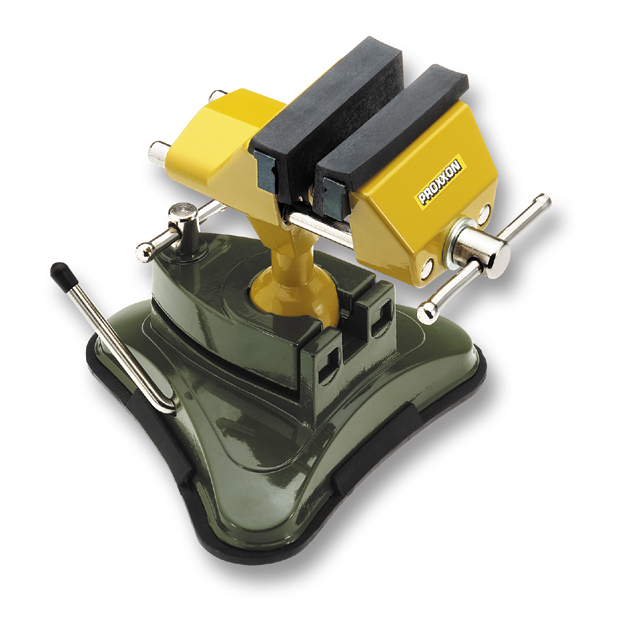 Durch Umlegen eines Spannhebels erzeugt die Gummiplatte unter dem Schraubstock ein Vakuum und saugt den Schraubstock auf allen glatten Flächen fest. Das Schraubstockoberteil ist durch ein Kugelgelenk in alle Richtungen schwenkbar. Backen mit Längs- und Querrille sowie abnehmbaren Gummischutzbacken.
