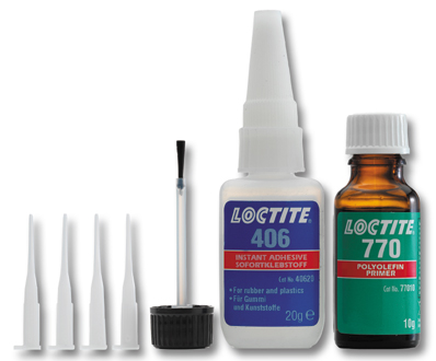<br /><br />LOCTITE® 406 / LOCTITE® SF 770 SET Ethyl-Cyanacrylat-Sofortklebstoff und Primer zur Vorbehandlung von Polyolefinen und anderen Materialien mit niedriger Oberflächenenergie.