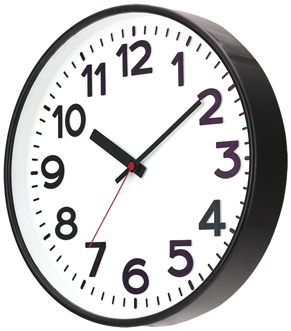 Funk-Wanduhr mit leisem Uhrwerk, schwarz, mit erhabenen Ziffern.