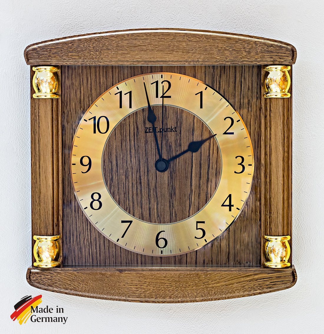 <br /><br />Präzise Funk-Wanduhr aus Eiche gerfertigt, teil-goldfarben, gut ablesbares Zifferblatt.