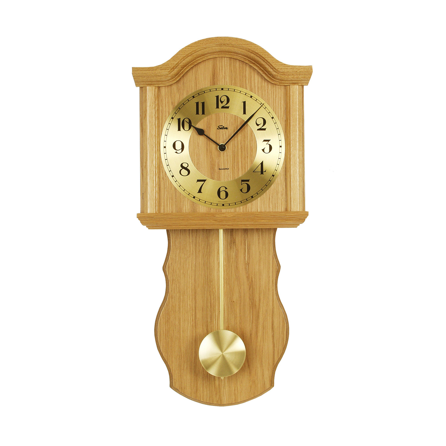 <br /><br />Quarz-Pendelwanduhr, aus Eiche natur gefertigt, goldfarbenes Zifferblatt mit arabischen Zahlen.