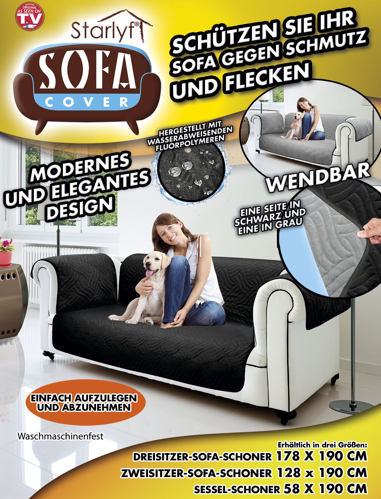 <br /><br />Das BESONDERE daran ist, dass unsere Sofa-Cover aus WASSERABWEISENDEN Fluorpolymeren hergestellt und WASCHMASCHINENFEST sind.