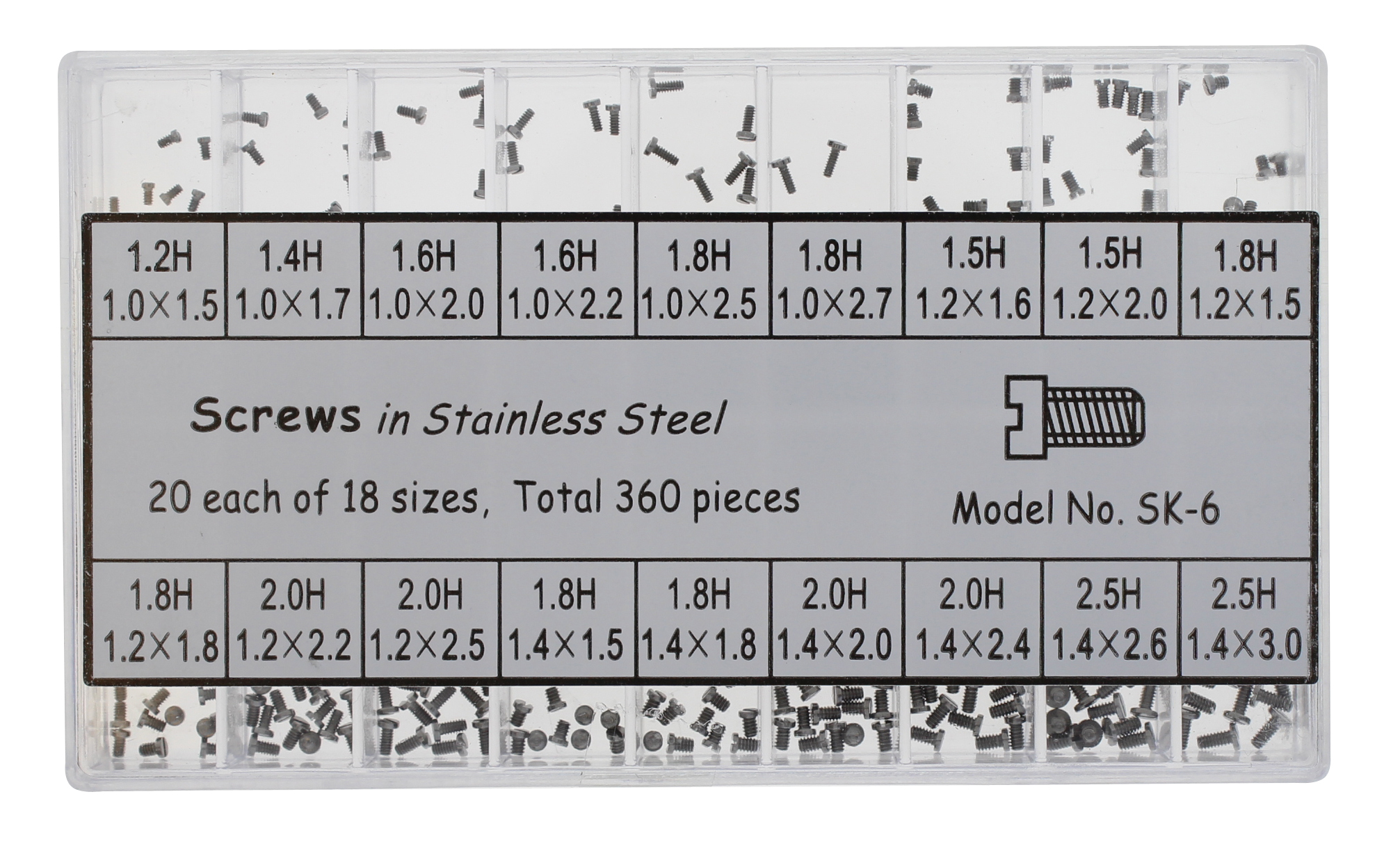 <br />Sortiment mit jeweils 20 Schrauben in 18 verschiedenen Abmessungen von M1 x 1,5 mm bis M1,4 x 3,0 mm.