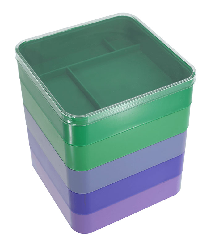 Aus Kunststoff, stapelbar, mit 4 verschiedenen, großen Innenfächern.