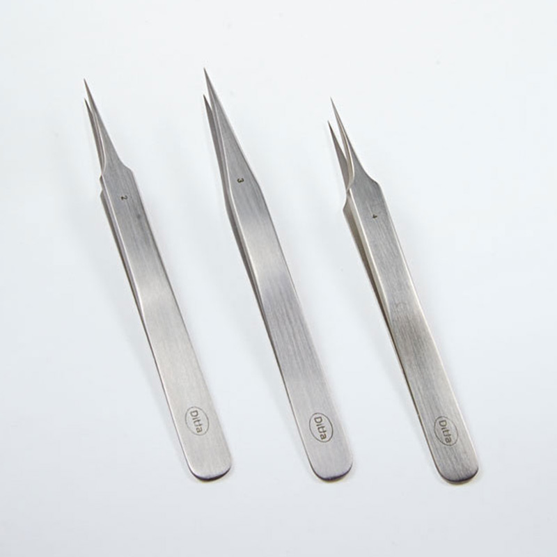 Standard-Pinzetten für feinste Arbeiten in Uhrmacherei und Feinwerktechnik. Feingeschliffener Edelstahl.