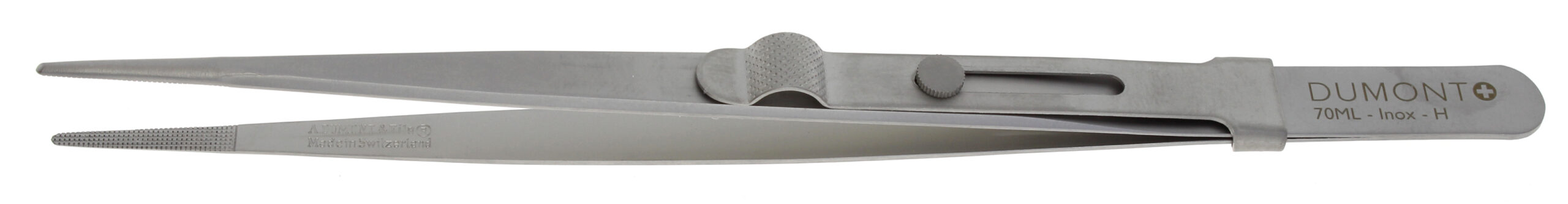 Rostfreier Stahl, Schweizer Qualität. Mit breiten, im Kreuzhieb gerieften, abgerundeten Spitzen (Breite ca. 1,5 mm). Mit Schieber zum Festspannen.