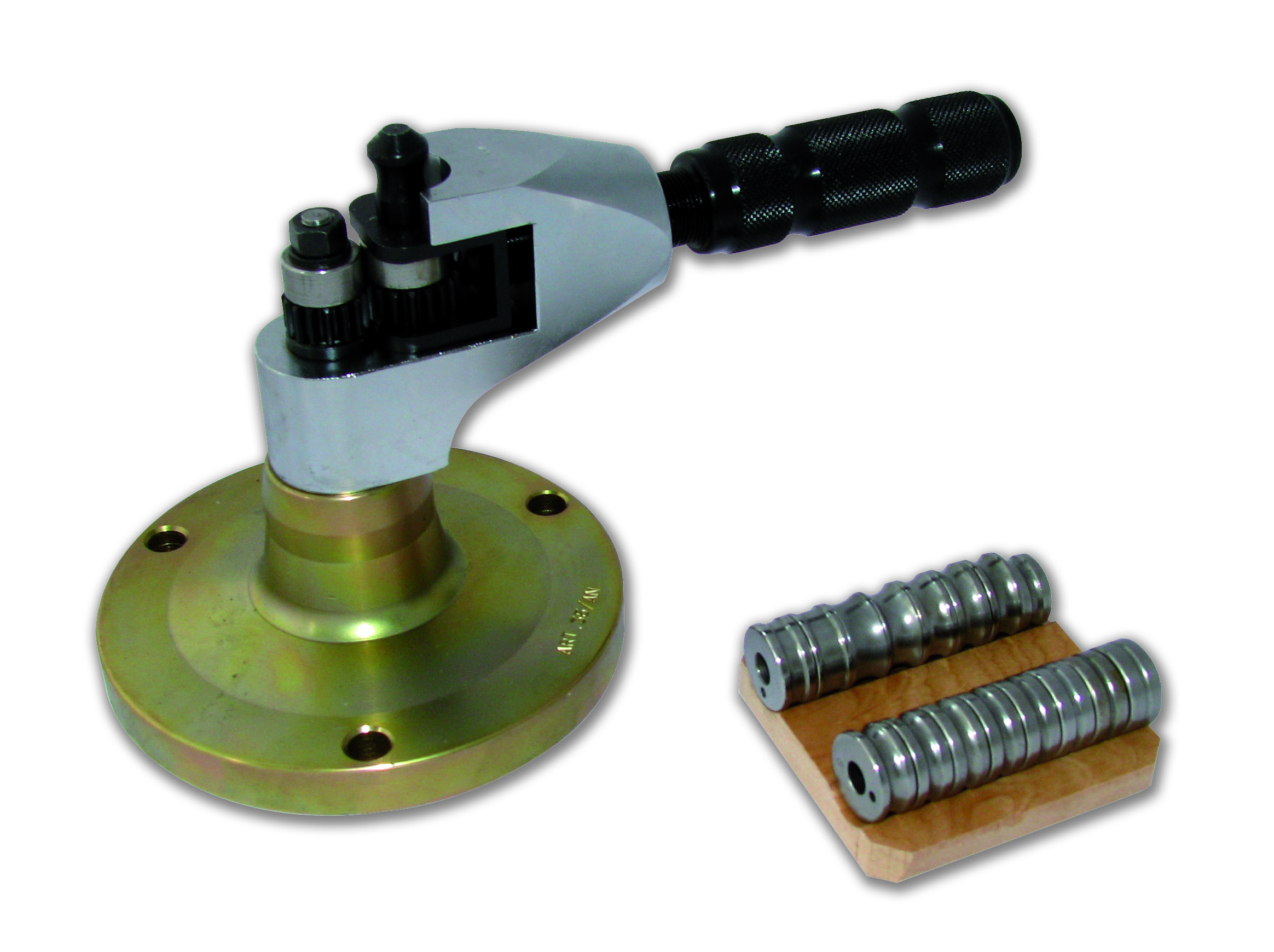 Für das Weiten von Steinringen durch Auswalzen der Ringschiene. Die Wahl der Profilstahlrollen richtet sich nach dem Ringprofil. Die Maschine sollte direkt auf dem Werktisch befestigt werden.