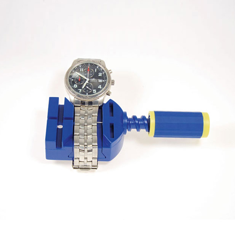 Zum Ausdrücken der Verbindungsstifte von Metallbandgliedern. Geeignet für Bänder mit einer Breite bis zu 20 mm. Solides Kunststoffgehäuse mit in der Höhe justierbarer Grundplatte, Gewindespindel mit Ausdrückerstift.