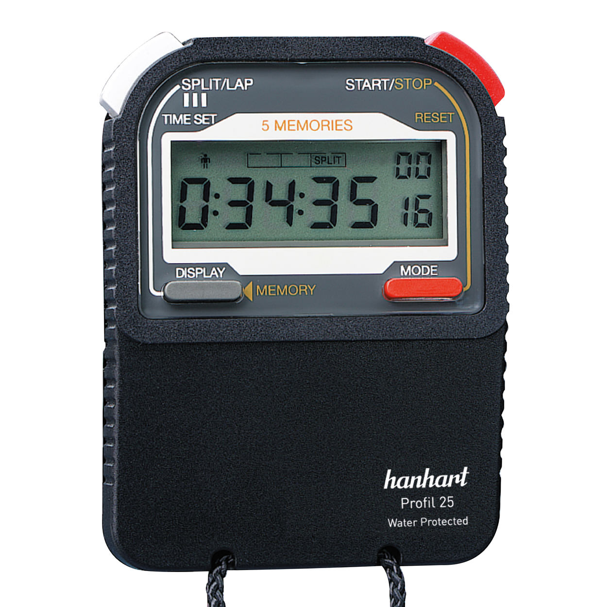 Die Profil 25 hat ein robustes, wassergeschütztes ABS-Gehäuse, eine sehr gut ablesbare LCD-Anzeige und ist zusätzlich mit einem Funktionsfenster für Split, Lap und Normalzeit ausgestattet.