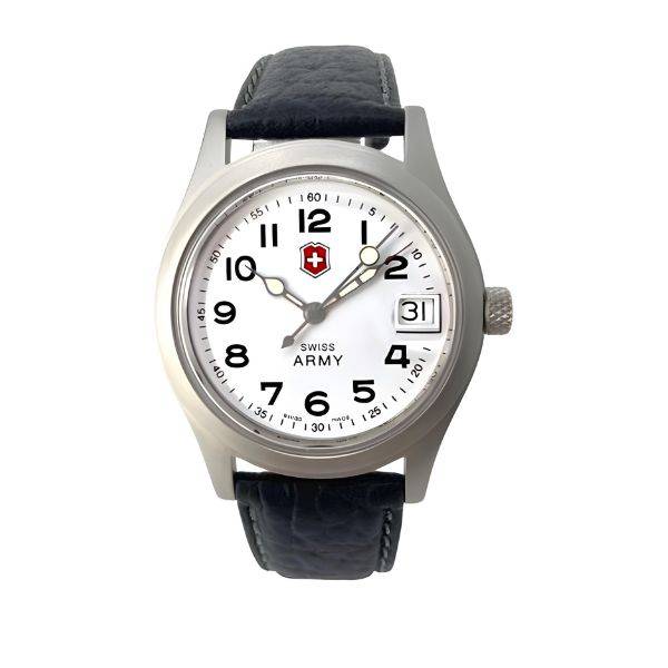 Swiss Army Basic Uhren Schweizer qualitäts Quartzwerk, klar ablesbares Zifferblatt (weiss), schwarze Klassikzahlen, aufgedruckt Minuterie (5 Minutenschritte), Datumsanzeige (3h), Leuchtzahlen, Zentralsekundenzeiger (ausgewuchtet), silberne LeuchtzeigerSatiniertes chromé Gehäuse (matt), verschraubte Krone, Acrlyglas mit Lupe für Datum, verschraubter Stahlboden, abgestepptes Kalbslederband (schwarz) mit Dornschliesse Echtleder:Die für Leder charakteristische Beschaffenheit der Oberfläche macht jede Uhr zu etwas ganz Besonderem. Leichte Farbabweichungen zum Bild sind daher nicht auszuschliessen. 3 ATM Wasserresistent (nach DIN)nicht zum schwimmen geeignet!Ø: 34 mm, h: 8 mm, ca. 33g 2 Jahre GarantiePreis inkl. Box KEINE Lieferung ausserhalb der Schweiz möglich! Swiss Army Uhren sind zuverlässig, funktional, gut durchdacht und verkörpern den Zeitgeist. Sie richten sich an Menschen, die viel unterwegs sind und sich dabei auf eine Schweizer Marke zu einem angemessenen Preis verlassen wollen. Das Schweizerkreuz im Logo zeugt von den hohen Qualitätsstandards der Schweizer Marke. Trotzdem zeichnet die Uhren ein ausgezeichnetes Preis-Leistungs-Verhältnis aus. Original New Old Stock Uhren AKTION: New Old Stock Uhren von ZENO-WATCH BASEL aus den 1990er Jahren.NOS = Neuwertige alte Swiss Army Lageruhren – Nur solange Vorrat! Diese Uhren wurden in unserem Atelier fachgerecht gelagert.Sehr kleine Kratzspuren sind nicht ganz auszuschliessen. Ungetragene alten Uhren mit Garantie des Herstellers. Diese Uhr kann gerne vor einer Kaufentscheidung besichtigt, und auch vor Ort in Basel abgeholt werden. Portofreie Lieferung! Nicht zuverwechseln mit Swiss Army Uhren von Victorinox®, Wenger®, oder Swiss Military Uhren® von CHARMEX, CHRONO oder HANOWA! Alle innerhalb des Internetangebotes genannten und ggf. durch Dritte geschützten Marken- und Warenzeichen unterliegen uneingeschränkt den Bestimmungen des jeweils gültigen Kennzeichenrechts und den Besitzrechten der jeweiligen eingetragenen Eigentümer. Allein aufgrund der blossen Nennung ist nicht der Schluss zu ziehen, dass Markenzeichen nicht durch Rechte Dritter geschützt sind.