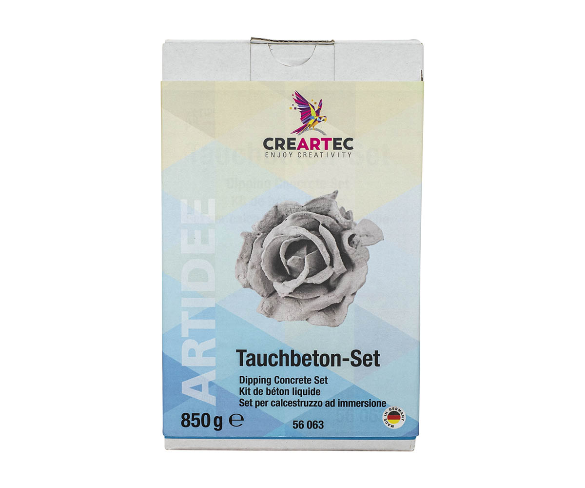 <br /><br />Wichtig: Nichtsaugende Tauchobjekte (Blumen, z.B. Rosen und Dahlien mit stabilen Blüten, sowie Blumen aus Kunststoff, Teile aus Styropor, Kunststoff, Holz etc.) müssen vorher mit Haftmedium (Bestellnr. 339942 oder 339943) vorbehandelt (getaucht oder eingestrichen) werden, damit sich die Klebeschicht nach dem Auftrocknen fest mit dem Tauchbeton verbindet. Saugfähige Textilien aus Wolle, Leinen etc. können direkt getaucht werden.