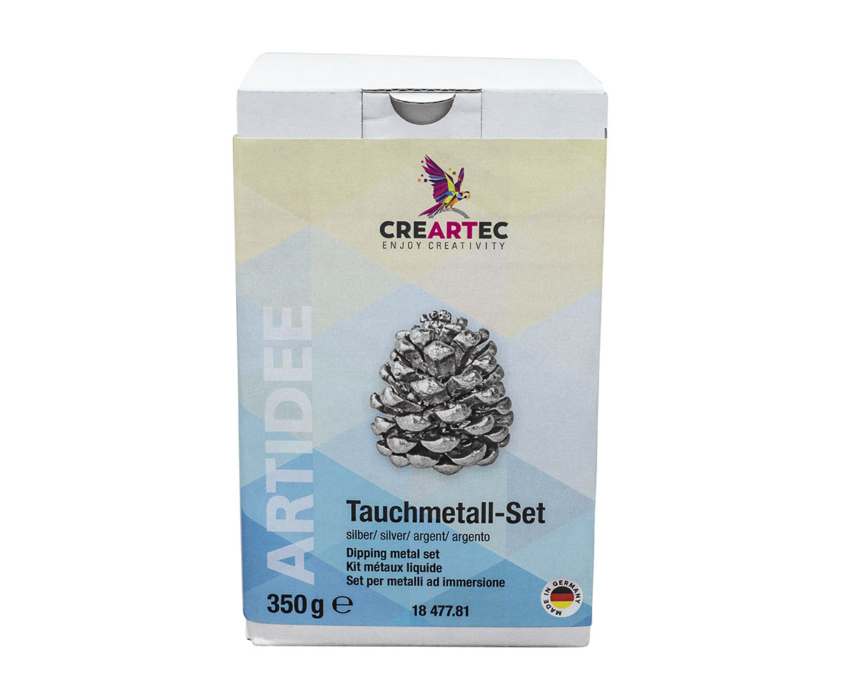 <br /><br />Die Tauchobjekte können vorher mit Haftmedium (Bestellnr. 339942/ 339943) vorbehandelt (getaucht oder ebenfalls mit einem Pinsel überstrichen) werden, damit das Tauchmetall beim Weiterbearbeiten fest darauf haftet. Saugfähige Textilien können vorher vollständig mit Stoff-Steif (Bestellnr. 339947) imprägniert und nach dem Trocknen und Erhärten in das Tauchmetall eingetaucht werden, damit es fest darauf haftet. Tauchmetall trocknet innerhalb von 40 – 60 Minuten fest auf und zeigt sofort sein metallisches Aussehen.